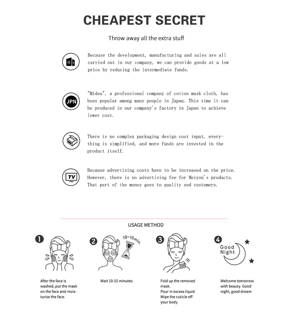 Compared to many other face masks in the market, with Mitomo¡¯s face mask, you can feel the difference immediately by using only once. When you apply our mask sheet to your face, you¡¯ll notice that your tired skin becomes much elastic, clear, younger and will relieve your skin from stress.