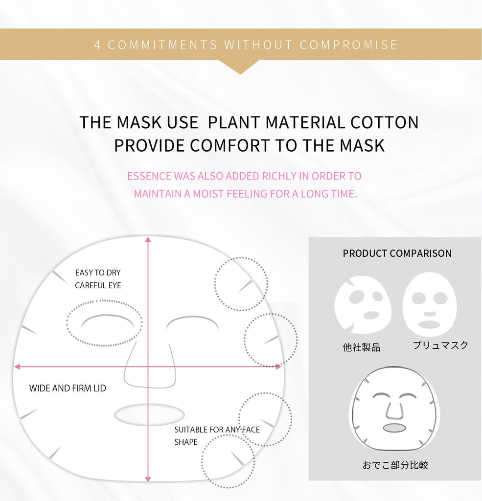MITOMO's special mask sheet features a unique technology that provides a continuous hydrating feeling coupled with satisfying smooth skin. As our specially formulated ingredients of the mask sheet absorbs onto the face, it constantly saturates from within and restores its ideal moisturizing level.
