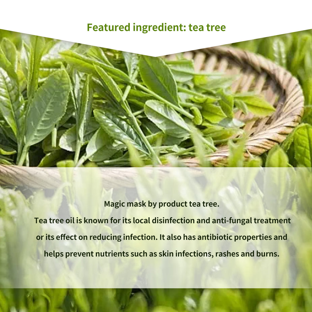A magical mask powered by tea tree. Tea tree oil is known for its localized antiseptic and antifungal effects, reducing inflammation and preventing skin infections, rashes, and burns.